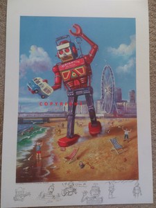 These prints are now creating quite a following. This particular image shows a Robot recovering a poorly camper van in front of the now demolished Wheel .